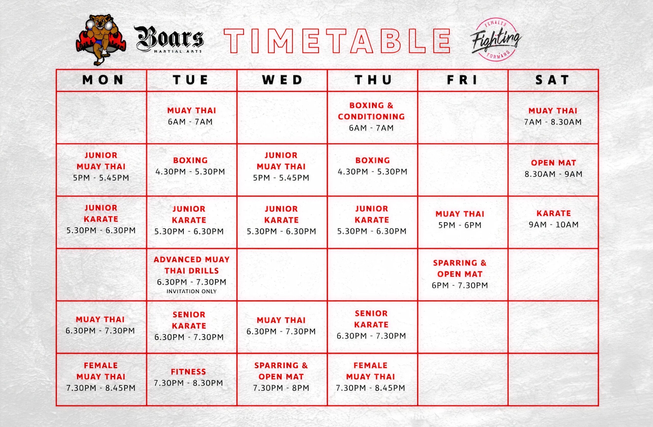 At Boars Martial Arts, we take pride in offering fun, supportive and challenging classes led by experienced coaches who are passionate about Muay Thai and our students. Whether you are stepping onto the mat for the first time or are a seasoned fighter, our classes cater to all ages and abilities.